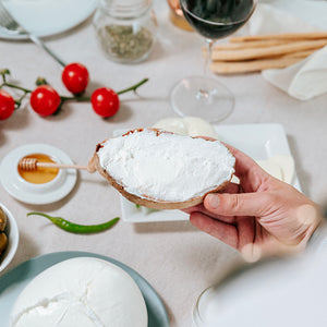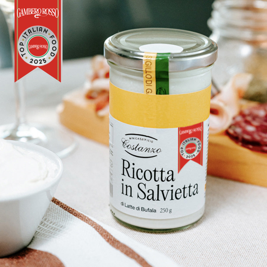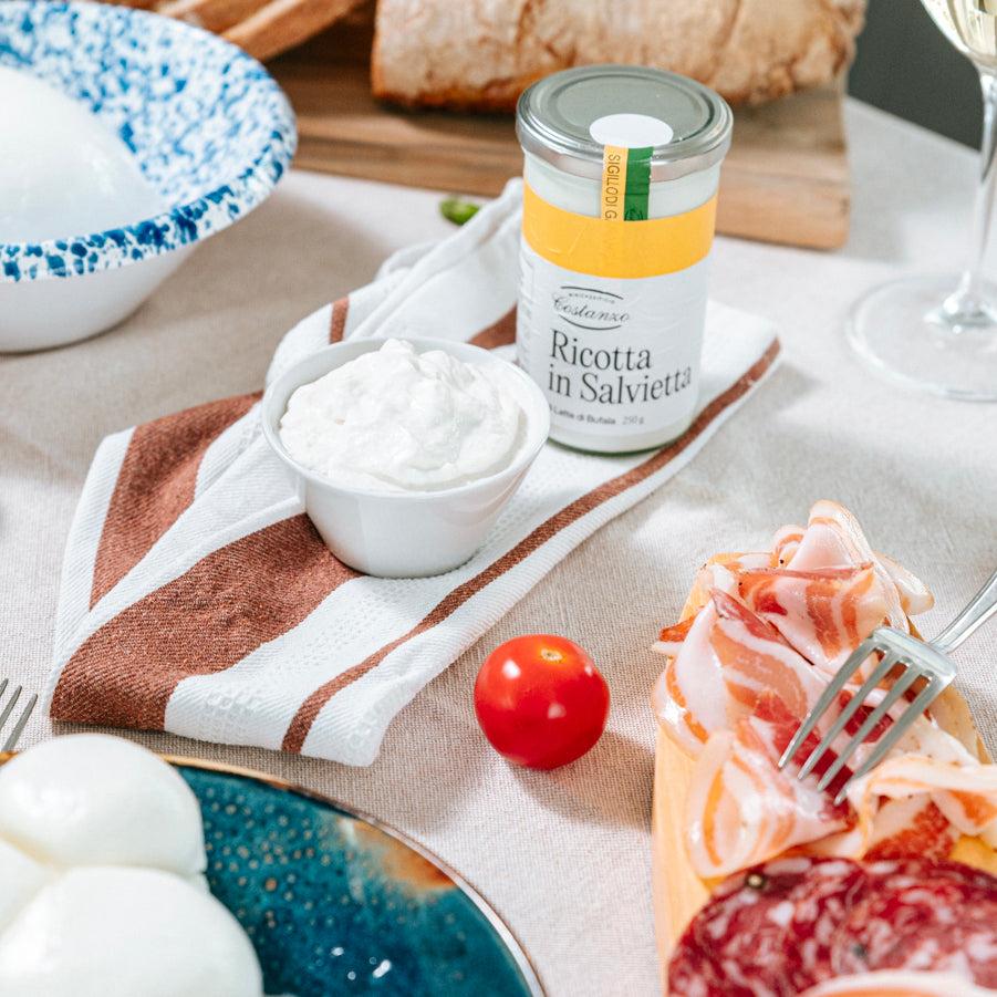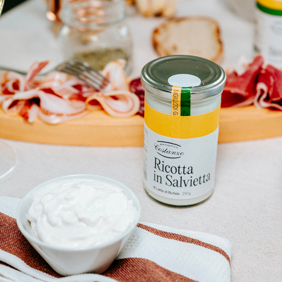 La ricotta di bufala in salvietta è prodotta con siero di latte di bufala pastorizzato, crema di latte di bufala pastorizzata, prodotta da noi, nel nostro caseificio, con il nostro stesso latte di bufala e sale.