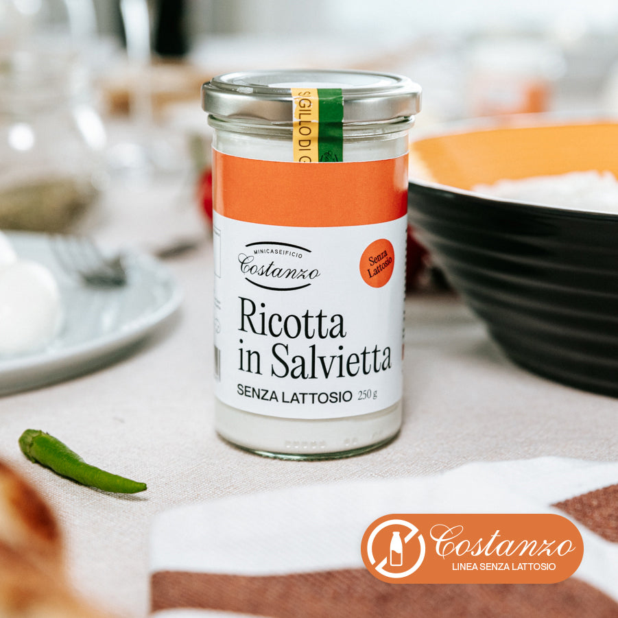 La ricotta di bufala in salvietta senza lattosio è prodotta con siero di latte delattosato.