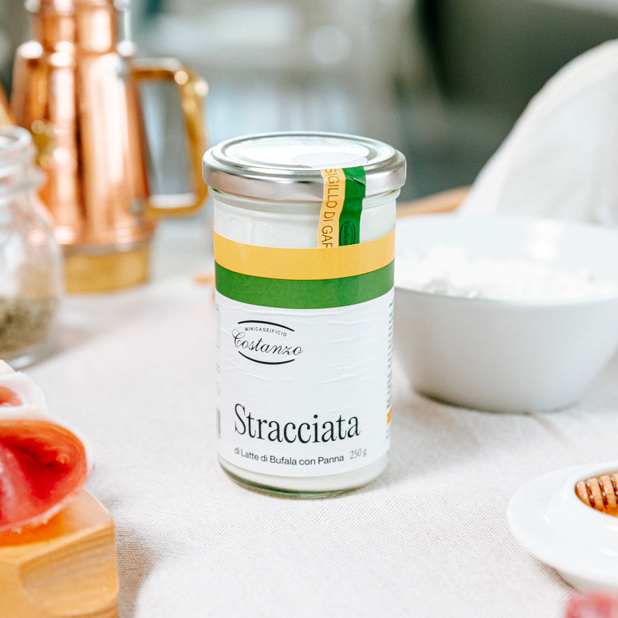Stracciata di bufala is made from 50 percent buffalo mozzarella (shredded, cut) and 50 percent cow's cream, salt and rennet.